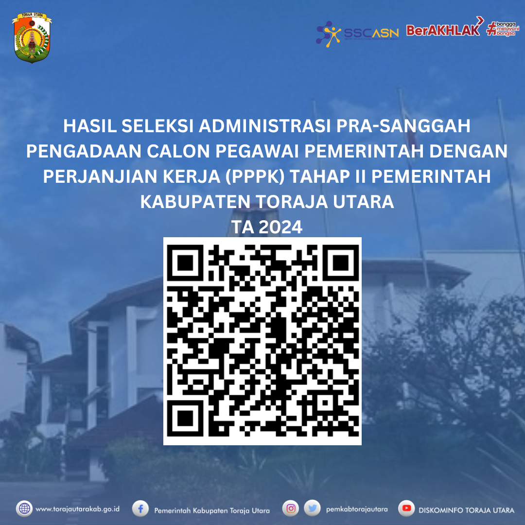 Berdasarkan hasil seleksi administrasi Calon Pegawai Pemerintah dengan Perjanjian Kerja (PPPK) Tahap I Pemerintah Kabupaten Toraja Utara Tahun Anggaran 2024, dengan